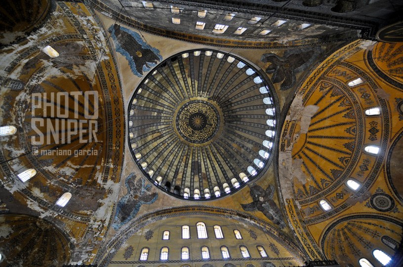 La inmensa cúpula, con un diámetro de 31 metros y una altura de 56 metros, construida en ladrillo y soportada solo por cuatro arcos, lo que le da apariencia de estar flotando en el aire, es una maravilla arquitectónica sin parangón.